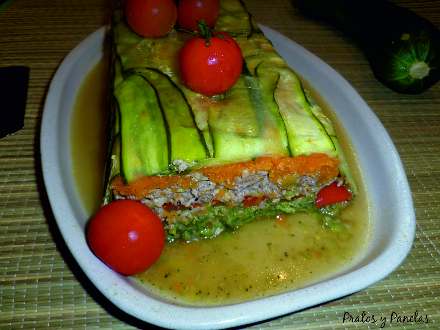Pré aquecer o forno a 180º e colocar um tabuleiro com agua dentro para que a terrina seja cozida em banho-maria.Já temos a terrina forrada com a courgette,colocar então a primeira camada que será de cenoura.Colocar a cenoura na terrina e espalhar bem.De seguida colocar a carne,espalhar bem.Depois colocar o pimento sobre toda a superfície da carne.Por ultimo colocar uma camada de broculos e espalhar bem.