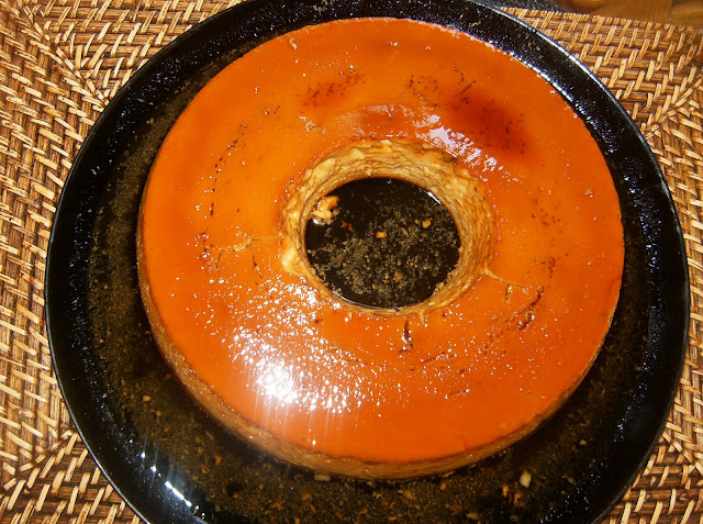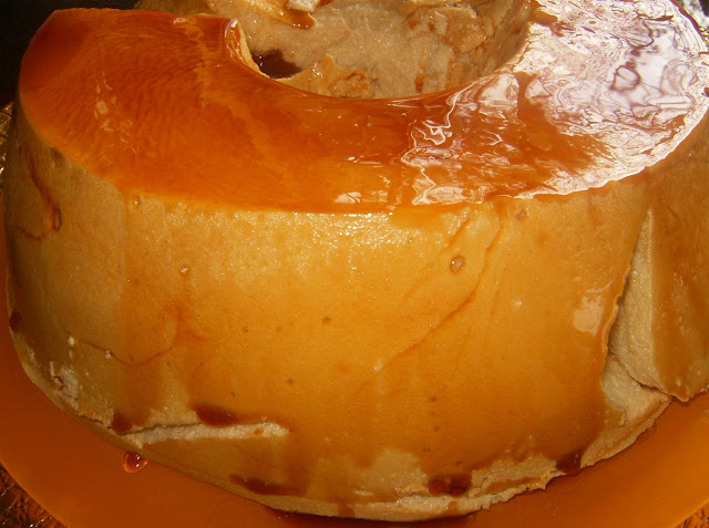Há dias e dias,logo eu que me considero uma sortuda com os pudins,desta vez fiquei realmente surpreendida ao acabar de desenformar um pudim que decidiu colar.O sabor ficou realmente delicioso mas o pudim foi um verdadeiro desastre.Penso que pelo facto de ser demasiado grande,deixei que cozesse demais e acabou por colar ao fundo.Mas desistir de um pudim tão saboroso,estava realmente fora de questão.Nada se perde ,tudo se transforma.E foi assim que o pudim se transformou numa espécie de bolo.