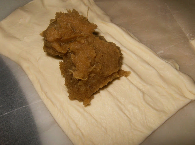 Cortar a massa em quatro partes iguais e sobre cada uma dessas partes colocar 1 c (de sopa) bem cheia da mistura previamente feita da gila com o pó de amêndoa.Fechar a massa em triângulo e com o dedo vincar bem as extremidades.Polvilhar os pasteis com o açúcar mascavado e levar a cozer em forno pré aquecido até estarem dourados.